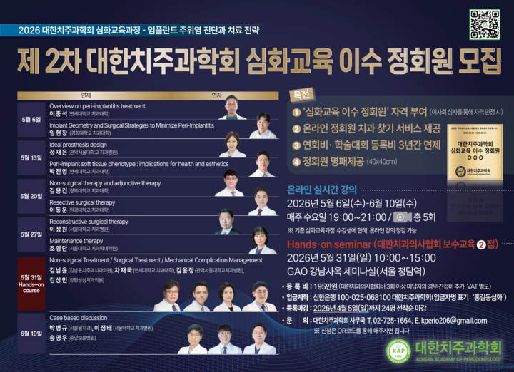 제2차 심화교육과정 등록은 선착순 24명, 4월 5일까지다. 과정을 이수한 회원에게는 ‘심화교육 이수 정회원’ 자격이 부여되고, 향후 3년간 학회 연회비 및 국내·국제 학술대회 등록비 면제, 학회 홈페이지 내 ‘온라인 치과 찾기 서비스’ 등록 등 혜택이 주어진다.