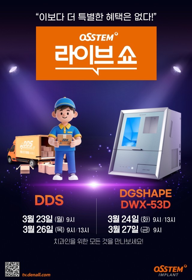 OSSTEM 라이브쇼 관계자는 “2026년 1분기 마지막 주 임상가들의 가격 부담을 줄이기 위해 24일부터 27일까지 DDS와 DWX-53D 론칭 특가 프로모션을 연이어 준비하고 다양한 혜택과 합리적 가격으로 부담까지 낮췄다”며 “치과 필수품과 최신상 프리미엄 밀링 머신을 최고 혜택으로 만나볼 수 있는 라이브쇼에 많은 관심과 시청을 부탁드린다”고 밝혔다.