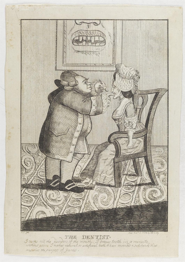 이번 그림은 Matthew Darly(1741-1792)가 1778년에 제작한 동판화 ‘The Dentist’이다(그림1). 영어 단어 Dentist는 현대 치의학의 아버지로 칭송받는 피에르 포샤르(Pierre Fauchard, 1678-1761)와 연관이 깊다. 1728년 출판된 그의 저서 ‘Le Chirurgien Dentiste(The Surgeon Dentist)'에서 dentist가 처음으로 사용되었다. 또한 그는 실외(장터)에서 발치하던 tooth puller의 지위를 실내(진료실)에서 환자를 치료하는 전문직업인 Dentist로 격상시켰다. 그는 인간의 존엄성을 위하여 반드시 환자는 바닥이 아닌 의자에서 진료되어야 한다고 주장하였다. 작금의 현실은 치과 밖으로 던져진 치과의 승부수가 사람들의 눈살을 찌푸리게 한다.