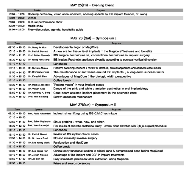 첫날인 26일 강연은 Wang Je Won 박사의 Developmental Logic of MagiCore 강연을 시작으로, 11개의 강연이 진행될 전망이다. 이어 이튿날인 27일에는 Faaiz Alhamdani 교수의 Indirect Sinus Lifting Using IBS C.M.C technique 강연을 비롯해 9개의 다양한 강연이 예정돼 있다. <아래 강연 프로그램 참조>