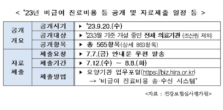 건강보험심사평가원(이하 심평원)이 2023년도 비급여 진료비용 공개를 위한 자료제출 및 공개 일정을 밝혔다.