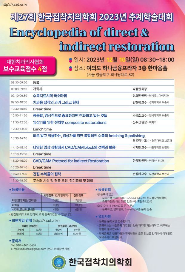 KAAD는 오는 12월 10일 서울 여의도 하나금융프라자에서 제27회 추계학술대회를 연다. 특히 이번 학술대회는 기초 이론부터 임상 적용법, 원리까지 접착 술식의 모든 것을 습득할 수 있는 자리가 될 것으로 기대된다. ‘Encyclopedia of direct & indirect restoration’을 대주제로 삼은 배경도 여기에 있다.
