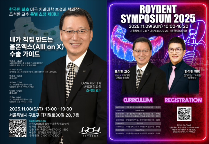 로이덴트치과기공소가 오는 11월 8~9일 서울 구로 마리오타워(디지털로30길 28)에서 ‘올온엑스 실전 마스터 클래스’와 ‘로이덴트 심포지엄(Roydent Symposium 2025)’을 개최한다.