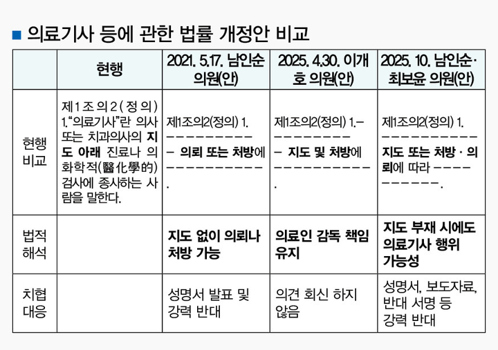 반면 이번에 새로 발의된 개정안은 ‘지도 또는(OR) 처방·의뢰’로 문구가 단순화됐고, 치과의사 등 의료인의 지도 없이도 의료기사의 행위가 가능하다는 해석이 생길 수 있다고 판단했다.