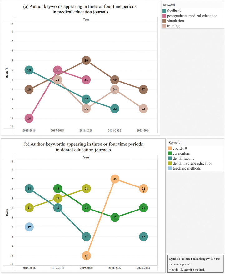 반면 치과교육에서는 ‘undergraduate dental education’이 지속 상위권에 올랐으나, ‘postgraduate dental education’이나 ‘residency’ 관련 키워드는 주요 항목에 포함되지 않았다. 대신 ‘educational technology(교육기술)’, ‘simulation(시뮬레이션)’, ‘virtual reality(가상현실)’, ‘psychomotor skills(심리운동술기)’ 등 교육공학과 임상술기 관련 키워드가 치과교육 연구의 중심을 이뤘다.