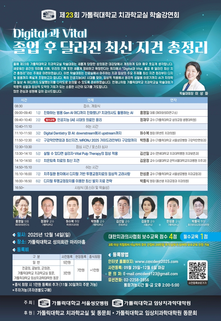 학술대회 사전등록은 12월 6일까지 학술대회 홈페이지(www.cmcdent2025.com)에서 가능하며, 참석자에게는 치협 보수교육 4점(필수윤리교육 1점 포함)이 인정된다.