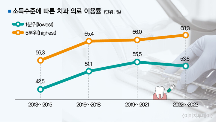 지난 10년간 우리나라 성인의 치과 이용률은 증가세를 보였으나 소득수준에 따라 여전히 뚜렷한 격차를 보여, 저소득층의 치과의료 접근성을 높이기 위한 정책 마련의 필요성을 대두시켰다.