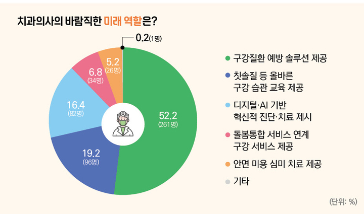마지막으로 국민들은 치과의사에게 어떤 미래 역할을 기대하고 있을까. 가장 높은 응답을 받은 항목은 절반이 넘는 응답자가 선택한 ‘구강질환 예방 솔루션 제공’(52.2%)이었다. 이는 국민들이 이미 문제가 발생한 치아 및 구강에 대한 치료는 물론이고, 이제는 예방을 통해 치과 질환 자체를 사전에 관리할 수 있는 방안을 치과의사들이 마련해 주기를 바라는 대목으로 해석이 가능하다.