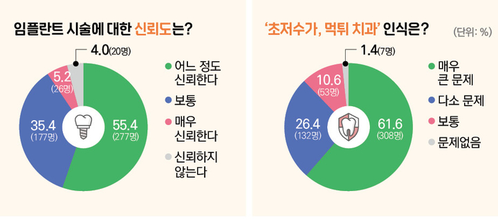 다만 비정상적인 임플란트 수가를 표방하거나 진료비 선 지급 후 갑자기 진료를 중단하는 사례에 대해서는 국민들도 매우 큰 우려를 하고 있는 것으로 조사됐다. 이른바 ‘초저수가, 먹튀 치과’에 대해 대다수 국민들은 ‘매우 큰 문제’(61.6%), ‘다소 문제’(26.4%)라고 응답한 반면 ‘문제없다’는 응답은 1.4%에 불과했다.