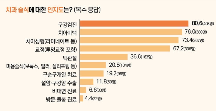 그렇다면 현재 치과에서 시행 중인 술식에 대해 국민들은 어느 정도 인식하고 있을까. 단, 임플란트 등 상대적으로 인지도가 높을 것으로 예상되는 일부 술식의 경우 답변 시 보기에서 제외했다.
