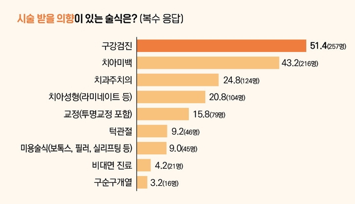 만약 향후 치과에서 시술을 받는다면 어떤 술식을 선택할 것인가를 묻는 질문에 대한 결과도 흥미롭다. 국민들은 ‘구강검진’(51.4%), ‘치아미백’(43.2%), ‘치과주치의’(24.8%), ‘치아성형’(20.8%), ‘교정(투명교정 포함)’(15.8%) 등의 순으로 선택했다.
