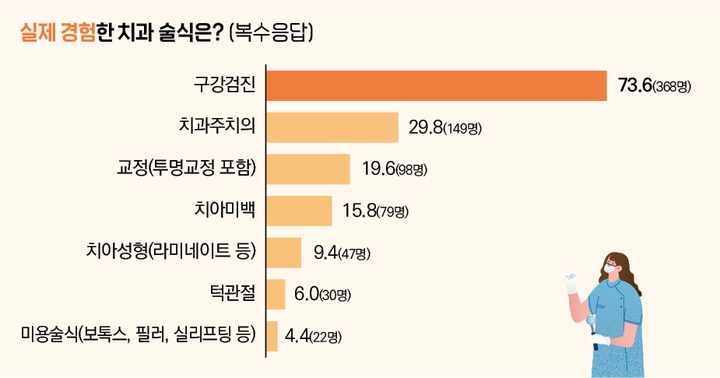 인지도와 실제로 진료를 받은 경험 사이의 간극은 컸다. 이번 조사에서 ‘실제로 치과에서 받아본 술식’을 묻는 질문에 ‘구강검진’(73.6%)과 ‘치과주치의 진료’(29.8%)를 선택한 국민들이 가장 많았다.