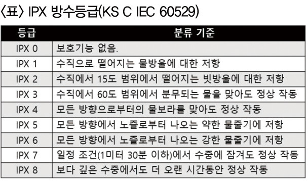 방수 등급: 물 세척이 잦거나 수술실에서 사용하는 풋 컨트롤러의 경우 IPX 6 등급 이상의 제품인지 확인하여 누전 사고를 예방하여야 한다.