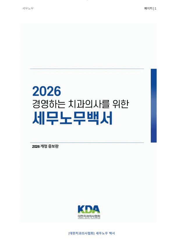 ‘2026 세무노무백서’는 치협 홈페이지(www.kda.or.kr) ‘개원114’ 게시판의 ‘세무/노무’ 메뉴에서 확인할 수 있다.