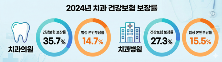 이에 따르면, 지난 2024년 치과병원의 건강보험 보장률은 27.3%, 치과의원은 35.7%를 기록했다. 직전 연도와 비교하면 치과병원은 1.9%p 상승, 치과의원은 0.6%p 하락한 기록이다.