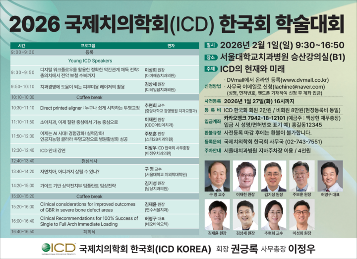ICD 한국회는 ‘ICD의 현재와 미래’를 대주제로 ‘2026 ICD 한국회 학술대회’를 오는 2월 1일 서울대학교치과병원 승산강의실에서 개최한다.