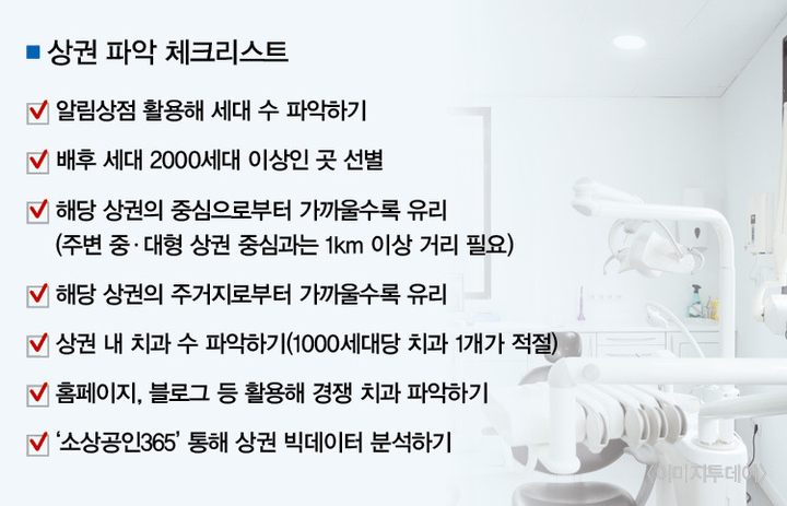 상권 내 치과 수 파악도 중요하다. 김 원장은 “1000세대당 1개를 기준으로 잡고 들어가는 것이 좋다”고 설명했다. 우리나라 인구수 대비 치과의사 수를 토대로 통계적으로 계산했을 때 치과의사 1명 당 1800여 명의 국민을 담당한다. 이를 가구당 인구로 치환하면 830세대당 치과의사 1명이 평균이다.