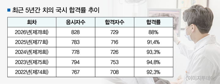 특히 이번 국시는 지난 5년 동안 응시자는 가장 많았으며 합격률은 가장 낮은 시험이었다. 구체적으로 지난 제74회 시험에서는 767명이 응시해 708명이 합격해 92.3%의 합격률을 보였으며, 제75회에서는 794명이 응시해 94.8%의 합격률을, 제76회 시험에서는 778명이 응시해 93.3%의 합격률을, 제77회 시험에서는 783명이 응시해 91.4%의 합격률을 기록한 바 있다.