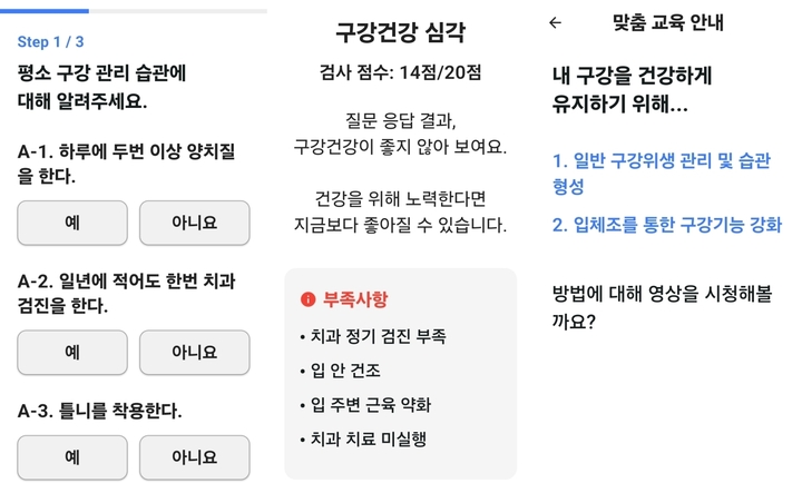 애플리케이션(앱)이 자가 진단 문항 결과를 토대로 대상자의 전반적 구강 상태에 대해 설명해주면서 자연스럽게 구강위생 관리 및 구강기능 강화를 위한 입체조 교육 동영상을 추천한다. 더불어 상태에 따라 치과 치료도 권장하면서 방치로 인해 구강건강이 저하되지 않도록 살뜰히 챙긴다.
