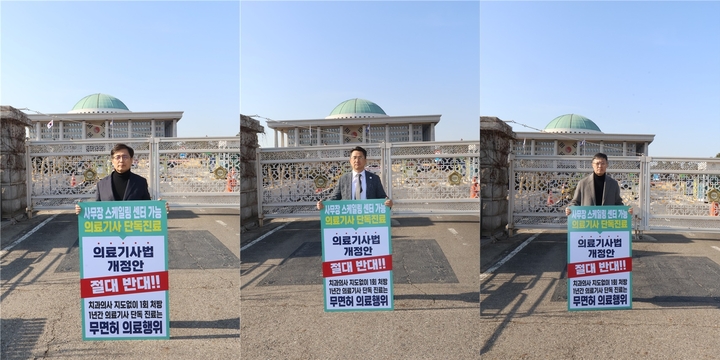 제33대 대한치과의사협회장 선거에 출마한 기호 1번 김민겸 후보가 최근 발의된 「의료기사 등에 관한 법률 일부개정법률안」의 전면 폐기를 촉구하며, 여의도 국회 앞에서 2월 28일 이상구 사무장, 권민수 회원과 함께 1인 시위에 돌입했다.