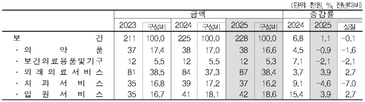 이 밖에 2025년 보건 전체 지출 항목을 살펴보면 치과 서비스에 지출한 금액이 전체 금액 중 16.2%를 차지했다. 또 치과를 제외한 1인 이상 일반 가구가 2025년도에 평균적으로 가장 많은 금액을 지출한 보건 항목은 ‘외래 의료 서비스(8만7000원)’였으며 이어 ‘입원서비스(4만2000원)’, ‘의약품(3만8000원)’, ‘보건의료용품 및 기구(1만2000원)’ 순이었다.