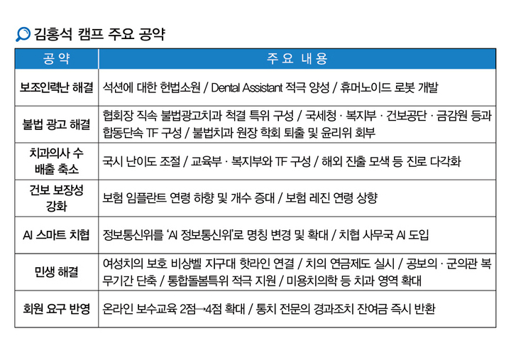 AI 시대에 맞춰 스마트 치협으로의 탈바꿈도 추진한다. 정보통신위원회를 ‘AI 정보통신위원회’로 명칭 변경 및 확대하고 치협 행정에 AI를 적극 도입한다. 스테이블 코인, CBDC 등 진료비 결제시스템에 선제적으로 대응한다는 공약도 눈에 띈다. 일선 개원가의 다양한 구성원의 요구에 부응하는 크고 작은 민생 해결 공약도 제시했다. 우선 보험 임플란트 연령 하향 및 개수 증대, 보험 레진 연령 상향 등 치과 건보 보장성 강화안을 내걸며, 급여 뿐 아니라 비급여 확대를 위해서도 노력한다는 계획이다. 카드 단말기 밴업체와 제휴해 카드 단말기 포인트로 치과 재료를 구매할 수 있도록 하는 공약이나 여성 회원들을 위한 비상벨 지구대 핫라인 연결, 치과의사 연금제도 실시, 장애인 치과전문의제도 도입 등도 눈에 띈다. 공보의 및 군의관 복무기간 단축에도 적극 나설 예정이다.