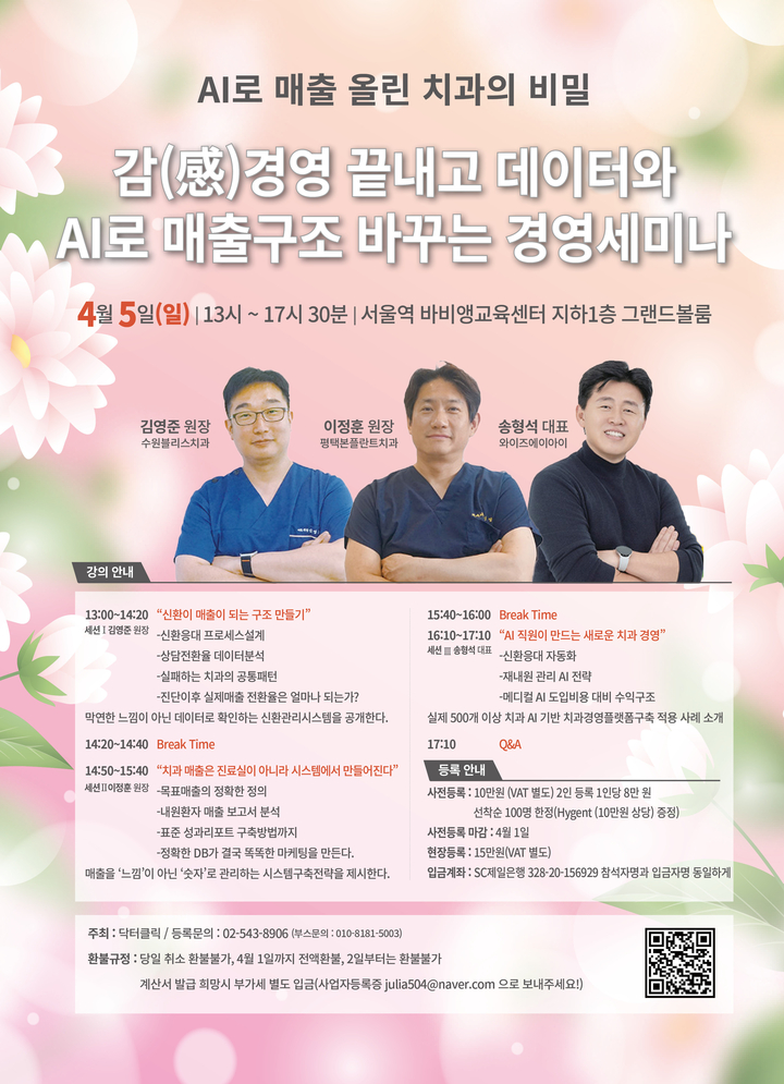 닥터클릭 측은 “치과 경영의 핵심은 더 이상 감(感)이 아니라 구조와 데이터다. AI는 단순한 기술이 아니라 시스템을 완성하는 도구”라며 “개원가의 관심이 ‘더 잘하는 진료’에서 ‘더 잘 설계된 경영 구조’로 이동하는 흐름 속에서, 이번 세미나는 실질적인 방향성을 제시하는 자리가 될 것”이라고 밝혔다.