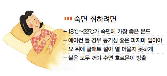 학회 측은 “사람은 기온이 18℃~22℃인 비교적 시원한 곳에서 자야 잠이 잘 들고, 밤 사이 자주 깨지 않고 숙면을 취할 수 있다”면서 “침실의 기온이 너무 높아도 안되고, 덥다고 에어컨을 세게 틀어 겨울용 잠옷을 입을 정도로 추워도 안된다”고 조언했다.