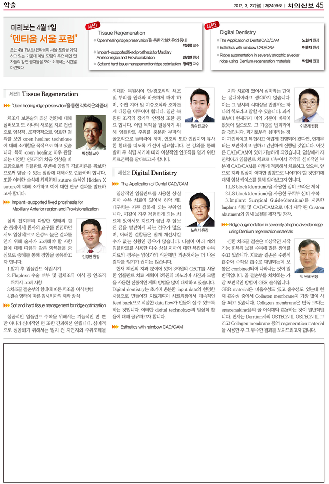 한편 덴티움 포럼에 처음 참여하는 박정철 교수는 “무엇보다 많은 선배님들께서 좋은 강의로 많은 것을 다뤄 주신 상태라 제가 더 새롭게 무엇을 나눌 수 있을지 고민이다. 다행히도 제가 지난 2년간 집중적으로 연구한 테마가 좋은 임상적 결과를 얻고 있어 이에 대한 보고를 하고 이를 통해 많은 참석자분들께서 좋은 아이디어를 얻으실 수 있기를 기대한다. 강의는 최대한 근거 중심으로 다양한 논문의 결과들을 다뤄 최신 경향을 제시할 예정이다”며 참가 소감을 밝혔다.